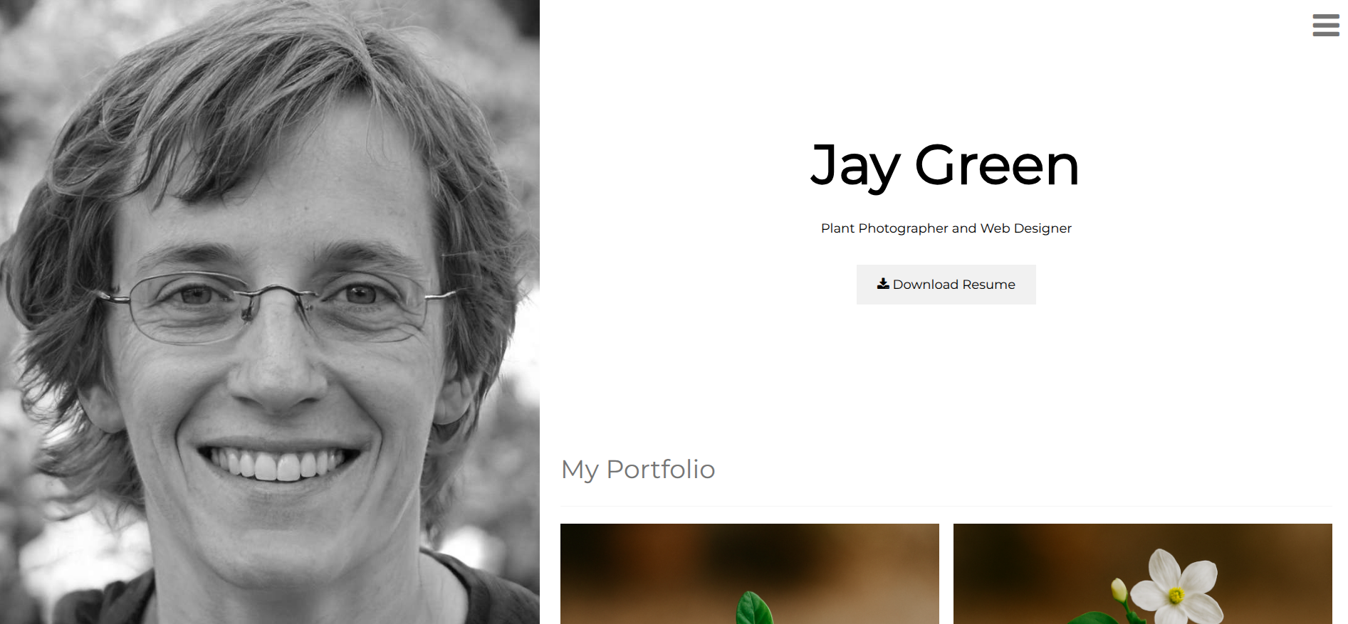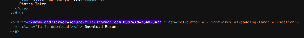 Browsing to the homepage, it was a simple portfolio site for a photographer named Jay Green. We noticed the resume download button had a link to /download?server=secure-file-storage.com:8087&id=75482342, which looked like a potential SSRF vector.