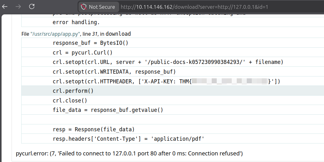 That errored out and the Werkzeug traceback leaked the API key, giving us the first flag: